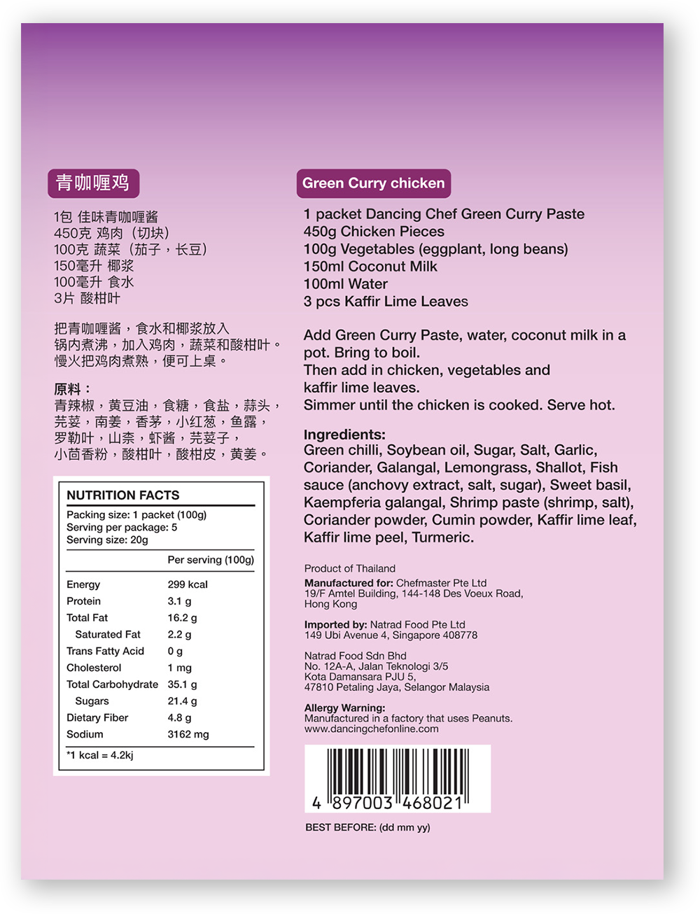 Green Curry is the quintessential Thai curry. Made with fresh green chillies and scented with an vibrant blend of herbs and spices, it is bright and vibrant aromatic curry that goes well with any meat or seafood.