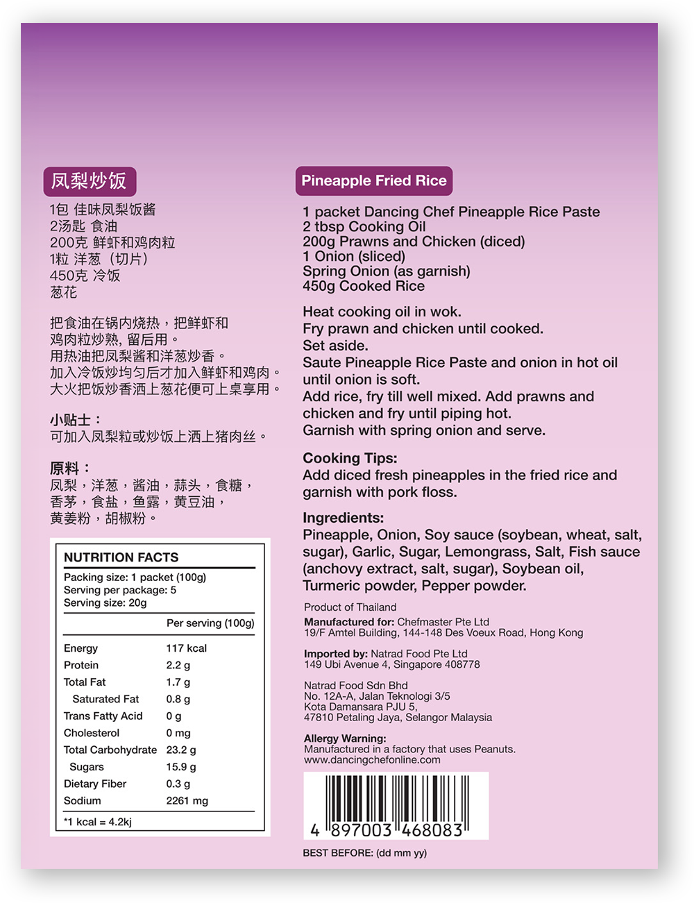 A Thai classic, this rice dish is popular in Thailand and abroad, for its beautifully golden colour and aromatic, sweet and savoury flavour. Dancing Chef Pineapple Rice Paste is made using real pineapples with no artificial flavouring.